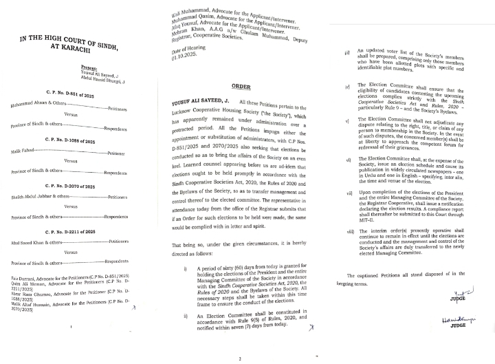 سندھ ہائیکورٹ کوآپریٹو رجسٹرار عبدالواجد شیخ کو یکم اکتوبر کو حکم دیا کی لکھنؤ کوآپریٹو ہائوسنگ سوسائٹی کے انتخابات 60 روز میں کرا کر عدالت میں رپورٹ جمع کرائیں، معزز عدالت کے دو رکنی بینچ مین شامل جسٹس یوسف علی سید اور جسٹس عبد الحمید نے اپنے تفصیلی فیصلے میں کوآپریٹو رجسٹرار کو حکم دیا ہے کہ کوآپریٹو ایکٹ اینڈ رولز کے مطابق اگلے 7 دن ایک الیکشن کمیٹی تشکیل دے جائے جو اصل سوسائٹی ممبران کی تازہ ترین ووٹر لسٹ تیار کرے، جس میں صرف وہی ممبران شامل ہوں جنہی قابل شناخت پلاٹ نمبرز کے ساتھ پلاٹ کے مالکان ہیں۔ الیکشن کمیٹی انتخاب لڑنے والے امیدواروں کی اہلیت کوآپریٹو ایکٹ ایند رولز اور سوسائٹی کے رجسٹرڈ قوانین کے مطابق یقینی بنائے۔ کمیٹی کو یہ اختیار نہیں کہ وہ کسی بھی تنازعہ کا فیصلہ کرے بلک متاثرہ ممبرز اپنے تنازعات حل کرانے کے لئیے مجاز فورم پر رجوع کریں الیکشن کمیٹی، سوسائٹی کے اخراجات پر ایک الیکشن شیڈول جاری کرے جسے ایک معروف اردو اور انگلش اخبار میں شائع کرایا جائے۔