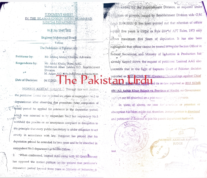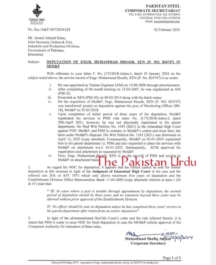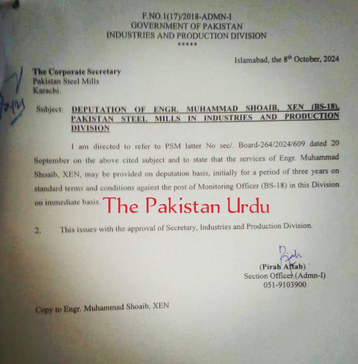 مذکورہ افسر انجینیئر شعیب کی ڈیپوٹیشن پر تعیناتی 2018 میں ہوئی جبکہ اس تعییناتی کی مخالفت کئی اعلی افسران نے کی اور سابق کمپنی سیکریٹری نے بھی وزارت صنعت و پیداوار کو خط لکھ کر مزکورہ افسر کی مذید ڈیپوٹیشن کی مخالفت کی اور وزارت صنعت و پیداوار کے لیٹر 8 اکتوبر 2024 اسلام آباد ہائی کورٹ کے فیصلے کی خلاف ورزی کرتے ہوئے وزارت میں ایکسین شعیب کی بطور مانیٹرنگ آفیسر غیر قانونی تعیناتی کے بارے میں لکھا ہے، تاہم تگڑی سفارش ہونے کی وجہ سے براجمان ہے۔