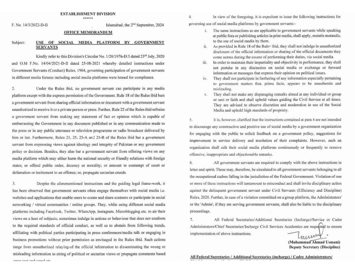اسٹیبلشمنٹ ڈویژن کے جاری کردہ میمورنڈم کے مطابق یہ فیصلہ سرکاری معلومات و دستاویزات افشاء ہونے سے روکنے کے لیےکیا گیا ہے جس میں سرکاری ملازمین کو ہدایت کی گئی ہے کہ وہ گورنمنٹ سرونٹس (کنڈکٹ) رولز 1964 کی پاسداری کریں۔ سرکاری ملازم سرکاری دستاویز اور معلومات غیر متعلقہ افراد کے ساتھ شیئر نہیں کر سکتا جب کہ سرکاری ملازمین ایسی رائے یاحقائق بیان نہیں کرسکتے جس سےحکومتی ساکھ متاثر ہو۔ ملازمین کو حکومتی پالیسی، فیصلوں، ملکی خودمختاری اور وقار کے منافی بات کی اجازت نہیں اور نا ہی ملازمین میڈیا پر ایسی بات کرسکتے ہیں جس سے دیگر ممالک سے تعلقات متاثر ہوں۔ سرکاری ملازمین کو اکثر سوشل میڈیا پر بحث و مباحثہ کرتے دیکھا گیا ہے، ہدایات کا مقصد سوشل میڈیا کے مثبت استعمال پر پابندی لگانا نہیں۔ ادارے اپنے سوشل میڈیا پلیٹ فارمز سے قابل اعتراض مواد ہٹانے کے لیے نگرانی کرتے رہیں اور تمام سروسز، گروپس کے سرکاری ملازمین ہدایات پر عمل درآمد کے پابند ہیں، خلاف ورزی پر متعلقہ ملازمین کے خلاف مس کنڈکٹ کی کارروائی کی جا سکتی ہے۔ اسٹیبلشمنٹ ڈویژن کے جاری کردہ میمورنڈم میں ہدایت دی گئی ہے کہ تمام وفاقی سیکرٹریز، ایڈیشنل سیکرٹریز، محکموں کے سربراہان اور چیف سیکرٹریز حکم پر عمل کروائیں گے۔