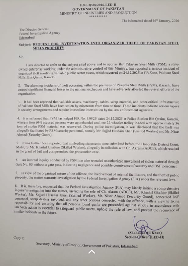 خط کے مطابق پاکستان اسٹیل ملز کے احاطے میں گزشتہ کئی عرصے سے قیمتی مشینری، کیبلز، اسکریپ مواد اور دیگر اہم انفراسٹرکچر کی چوری کے واقعات مسلسل ہو رہے تھے، جنہیں نظر انداز کیا جاتا رہا۔ ان واقعات نے سیکیورٹی نظام کی سنگین ناکامی اور اندرونی ملی بھگت کو بے نقاب کر دیا ہے۔